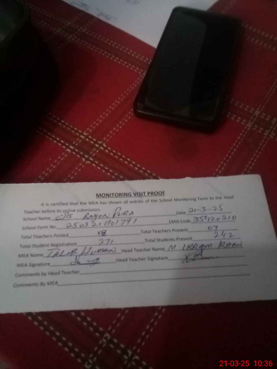 | Attendance Register | Head Teacher | MEA with School | Visit Proof |
