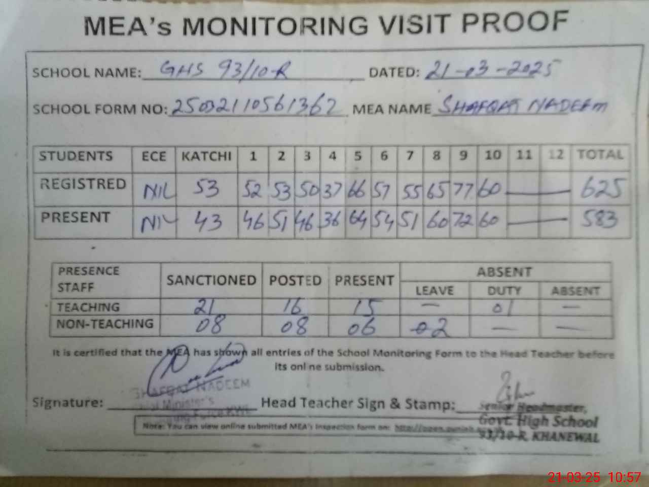 | Attendance Register | Head Teacher | MEA with School | Visit Proof |