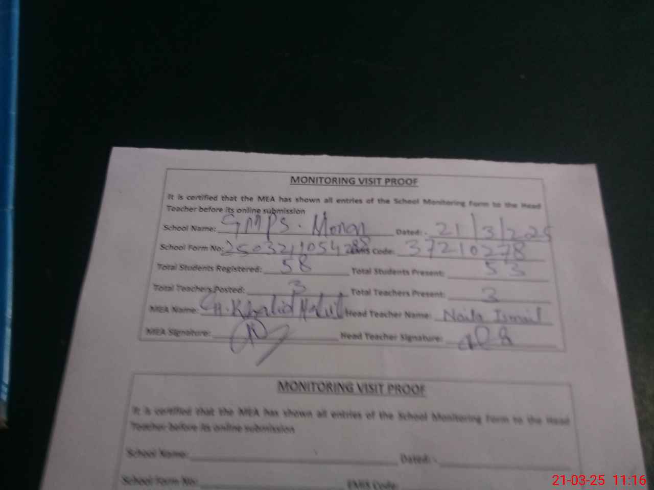 | Attendance Register | Head Teacher | MEA with School | Visit Proof |