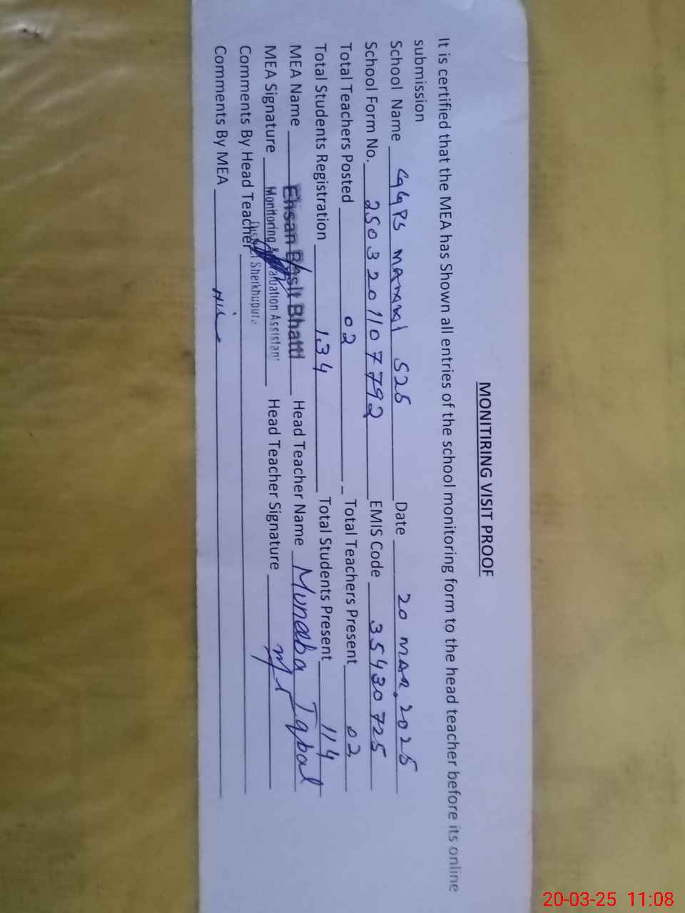 | Certified that this School was Inspected by the Undersigned MEA/DMO Today and the Information Stated Above is as Per Record. | |||||