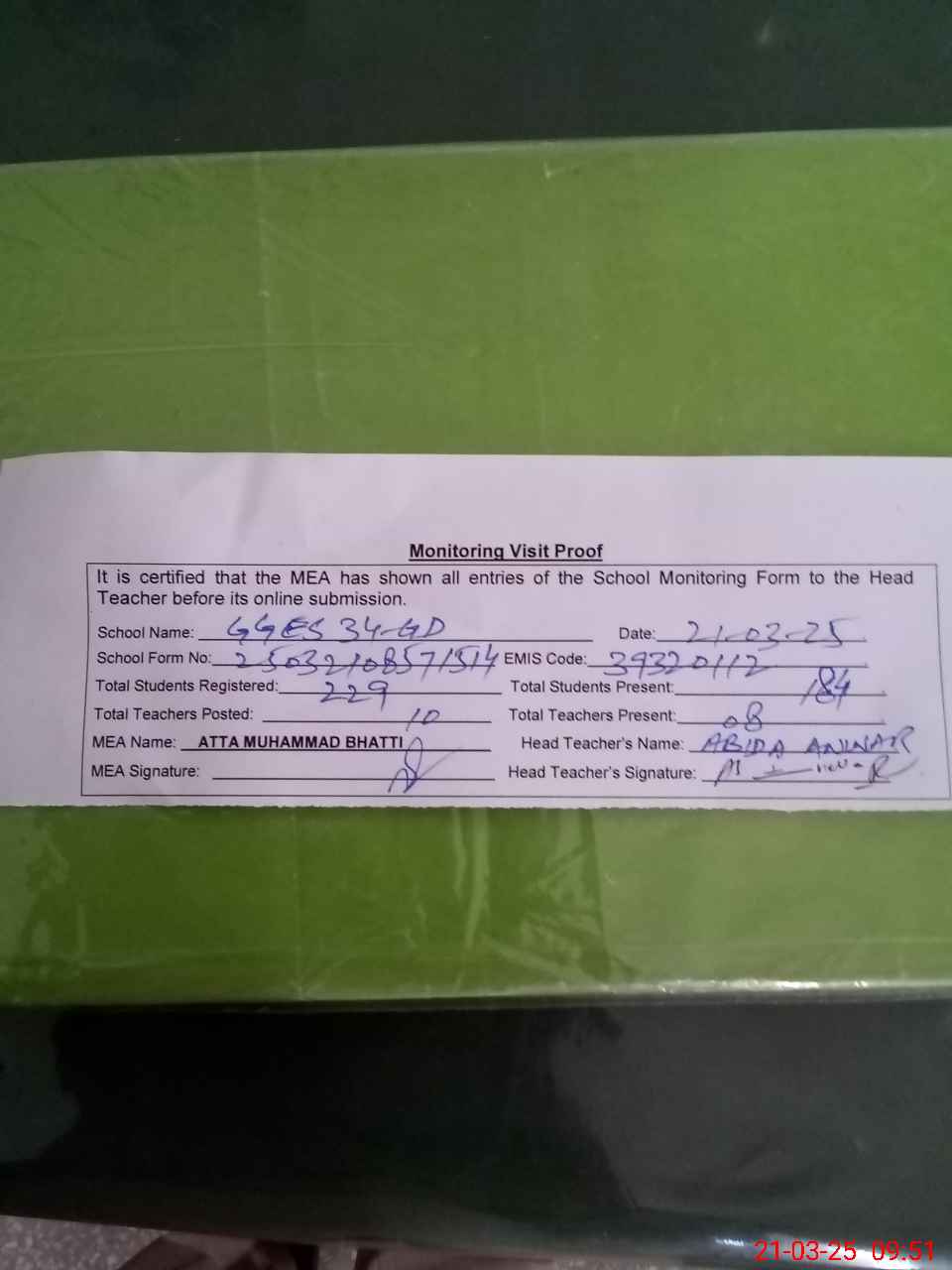 | Certified that this School was Inspected by the Undersigned MEA/DMO Today and the Information Stated Above is as Per Record. | |||||