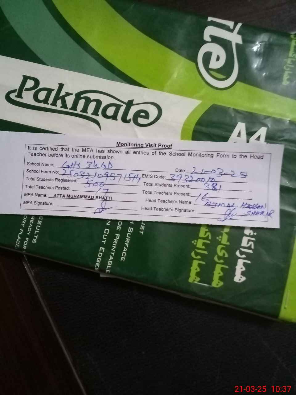 | Attendance Register | Head Teacher | MEA with School | Visit Proof |
