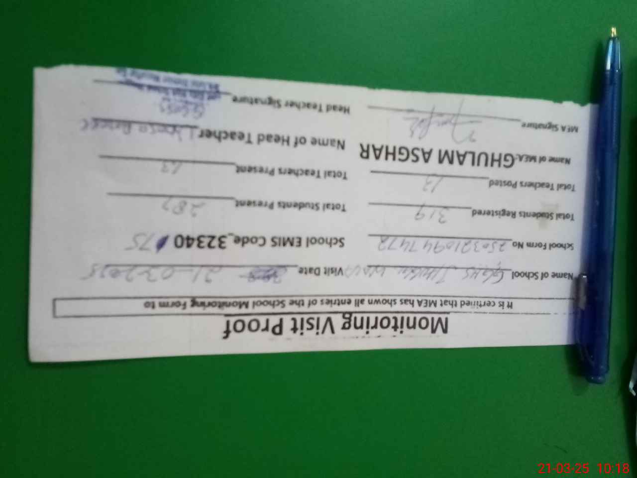 | Name: Ta**** Sh**** Na**** Designation: (School Headmaster's/Headmistress's) HEADMASTER Phone/Cell Number: 03**** |