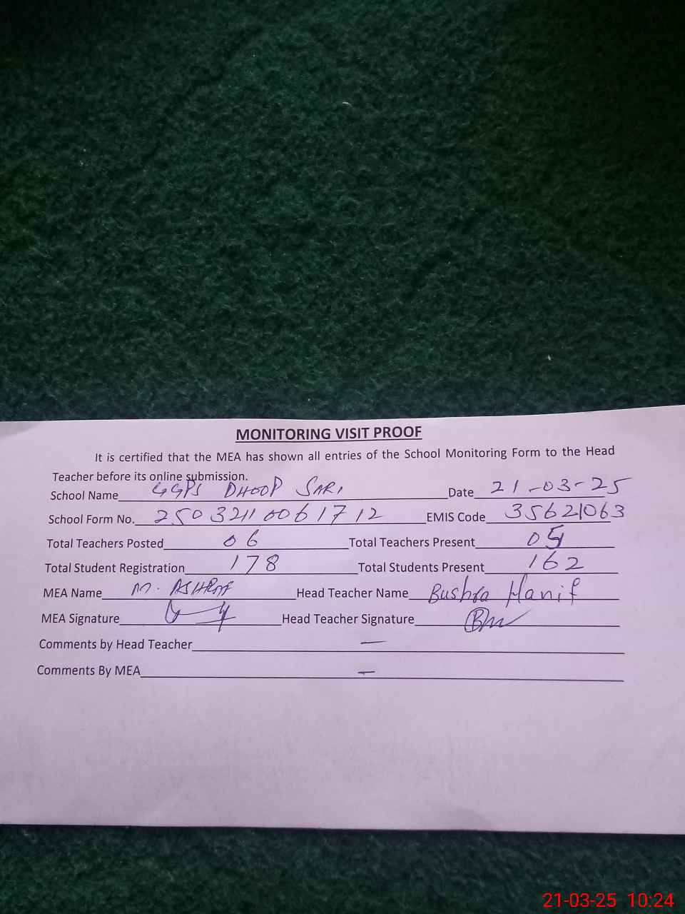 | Attendance Register | Head Teacher | MEA with School | Visit Proof |