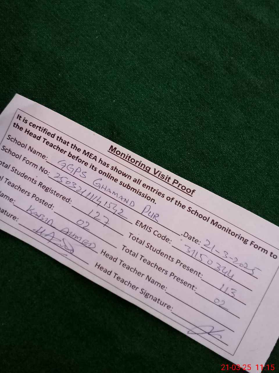 | Attendance Register | Head Teacher | MEA with School | Visit Proof |