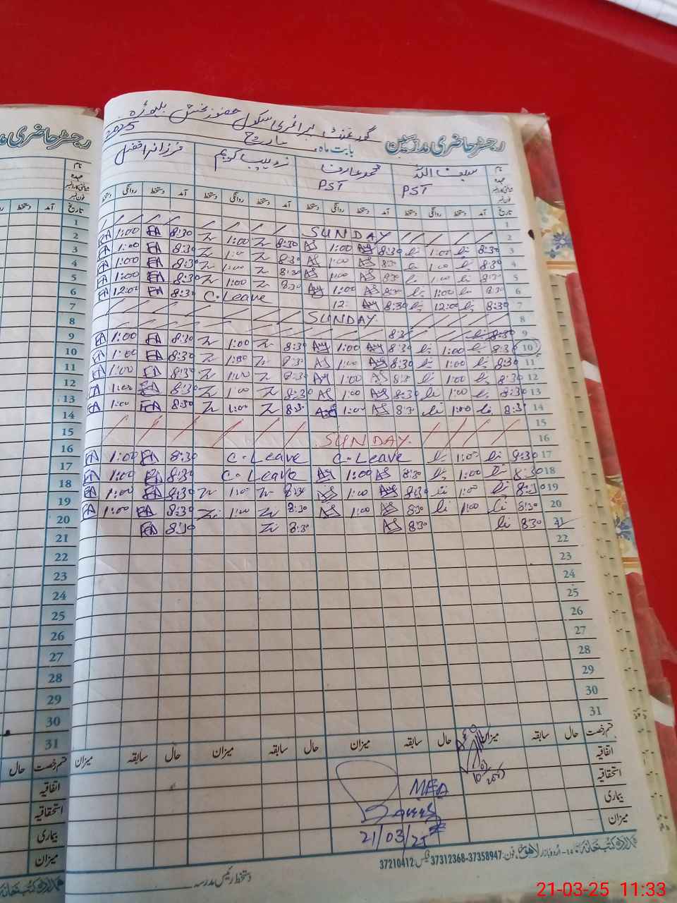| CNIC | Full Name | Designation | R/C | Absence During Last Calender Month |