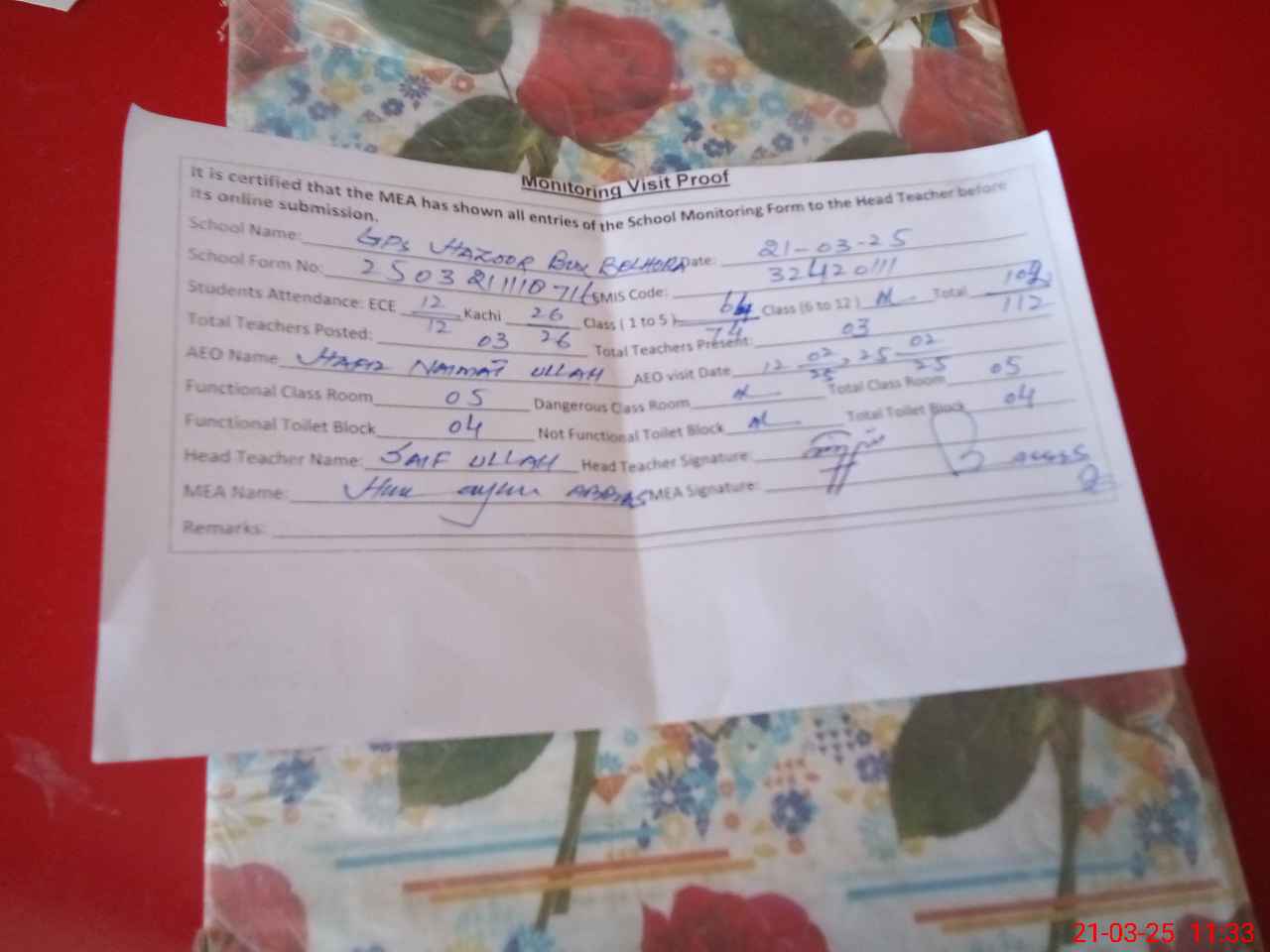 | Attendance Register | Head Teacher | MEA with School | Visit Proof |