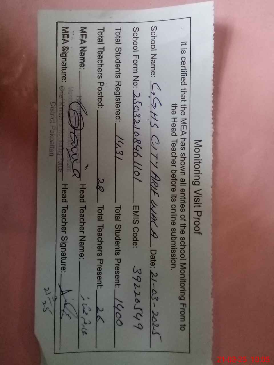 | Attendance Register | Head Teacher | MEA with School | Visit Proof |