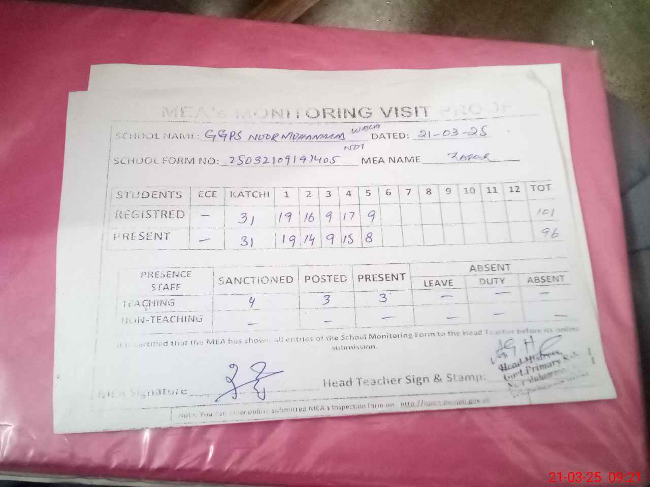 | Attendance Register | Head Teacher | MEA with School | Visit Proof |