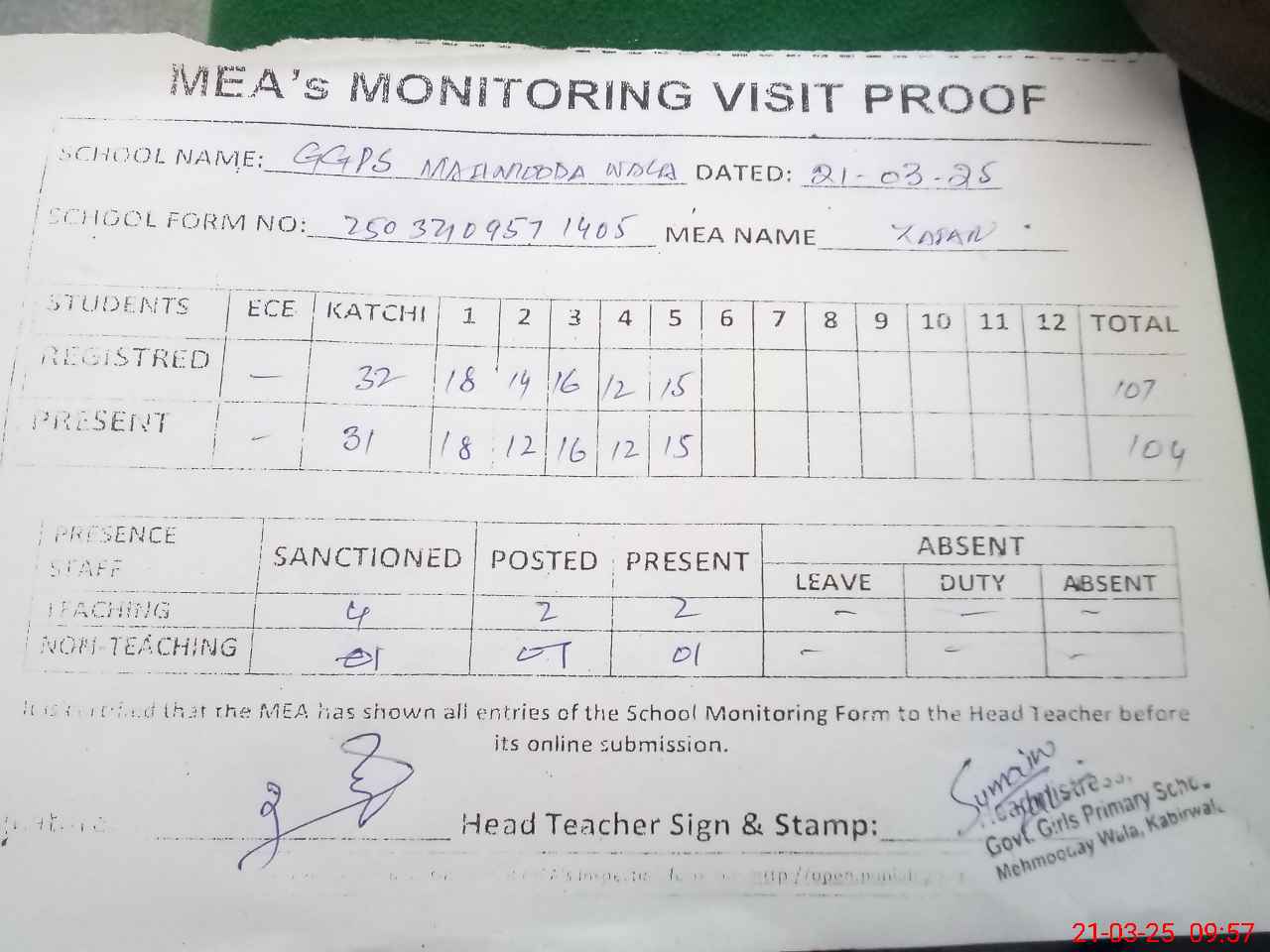| Attendance Register | Head Teacher | MEA with School | Visit Proof |
