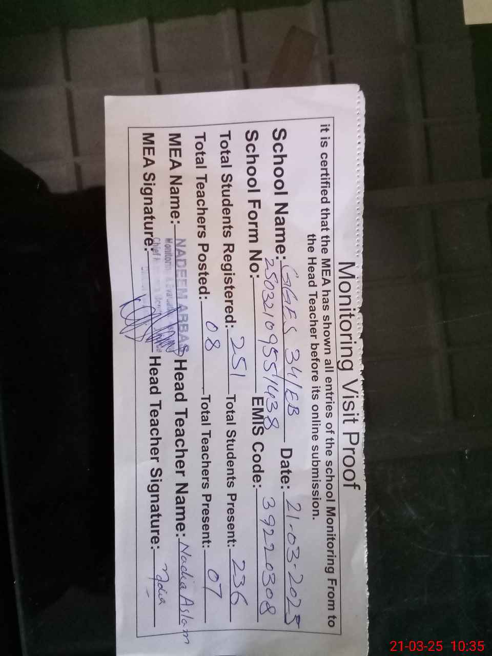 | Certified that this School was Inspected by the Undersigned MEA/DMO Today and the Information Stated Above is as Per Record. | |||||
