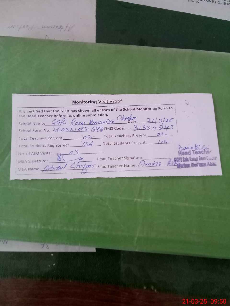| EMIS Code: 31330843 | Name of School: GGPS RAEES KARAM DIN CHACHAR | |||