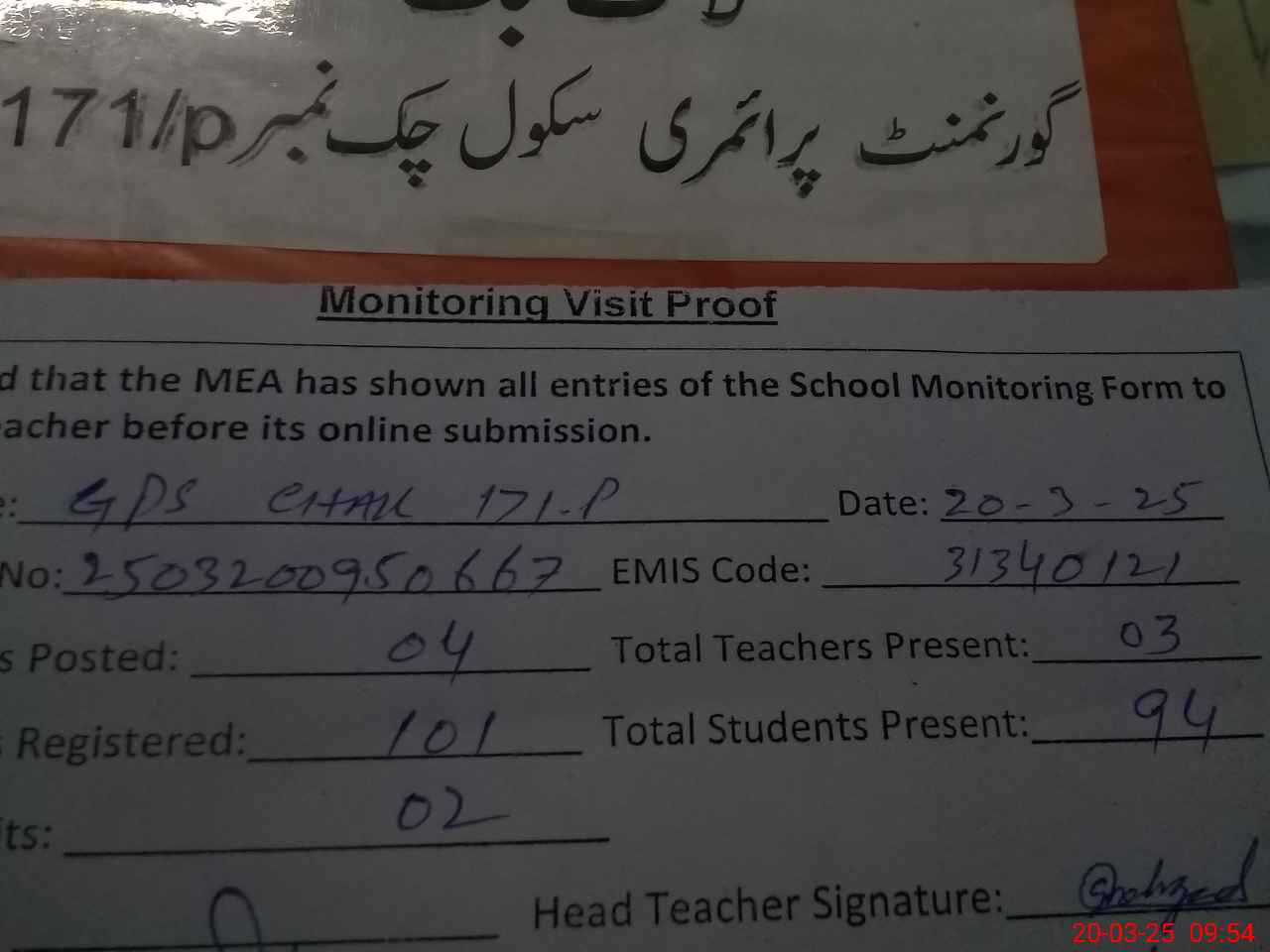 | Attendance Register | Head Teacher | MEA with School | Visit Proof |