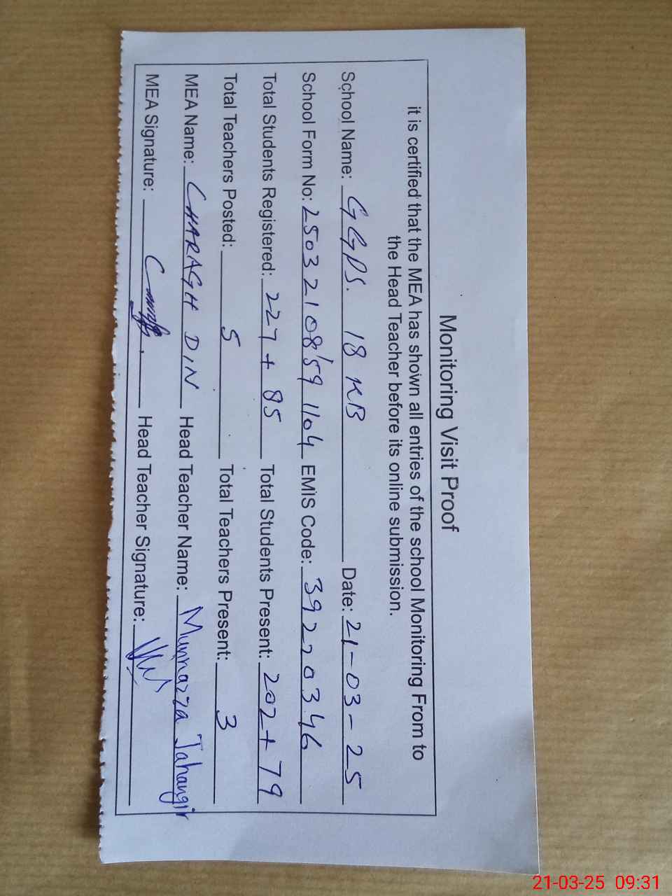 | Attendance Register | Head Teacher | MEA with School | Visit Proof |