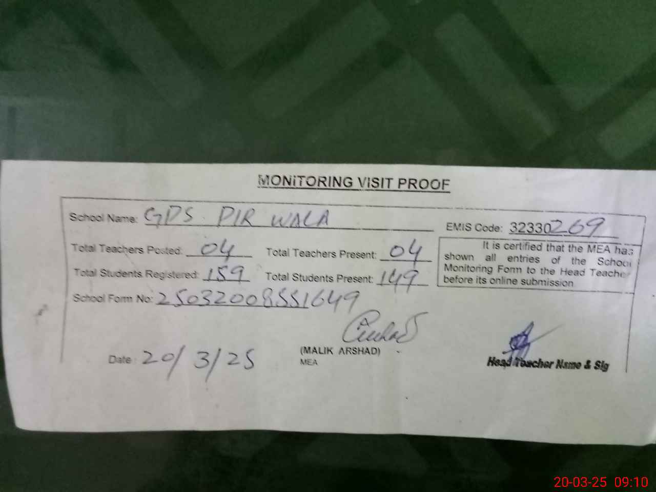 | Attendance Register | Head Teacher | MEA with School | Visit Proof |