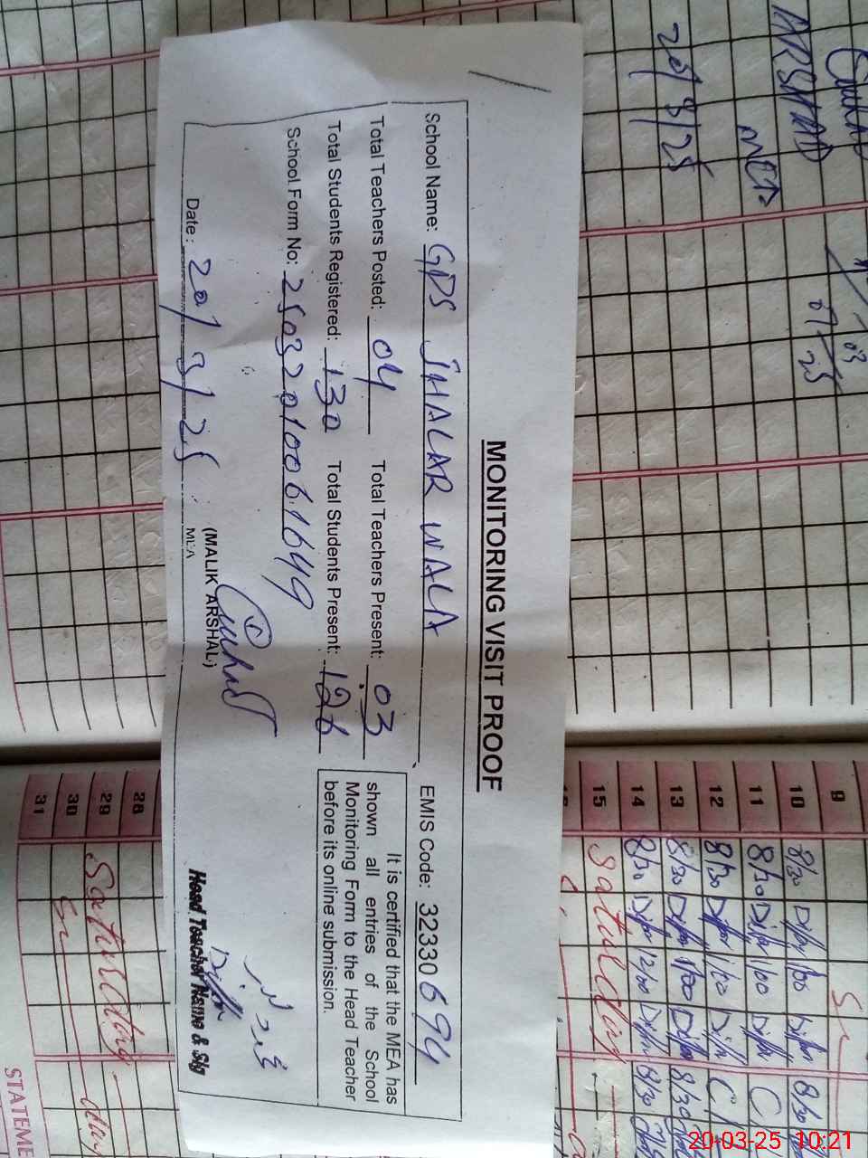 | Attendance Register | Head Teacher | MEA with School | Visit Proof |