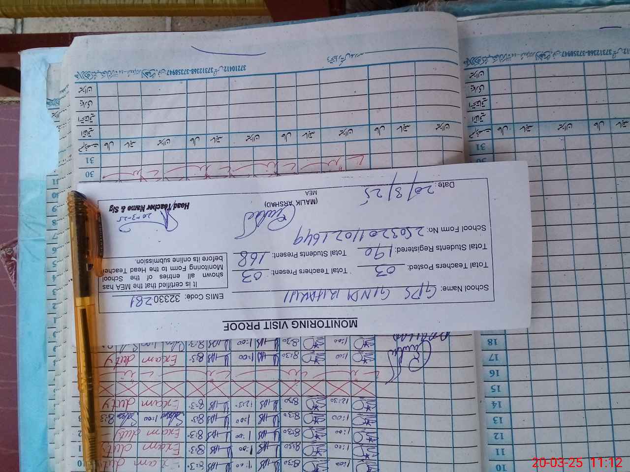 | Attendance Register | Head Teacher | MEA with School | Visit Proof |