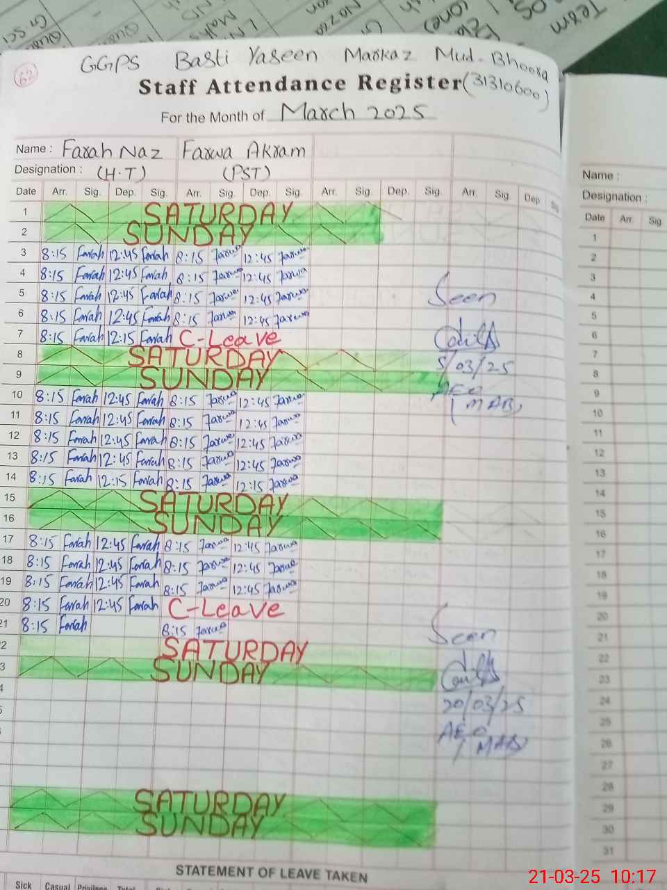 | Leave | Duty | Absent | Maternity | Medical | Ex- Pak |