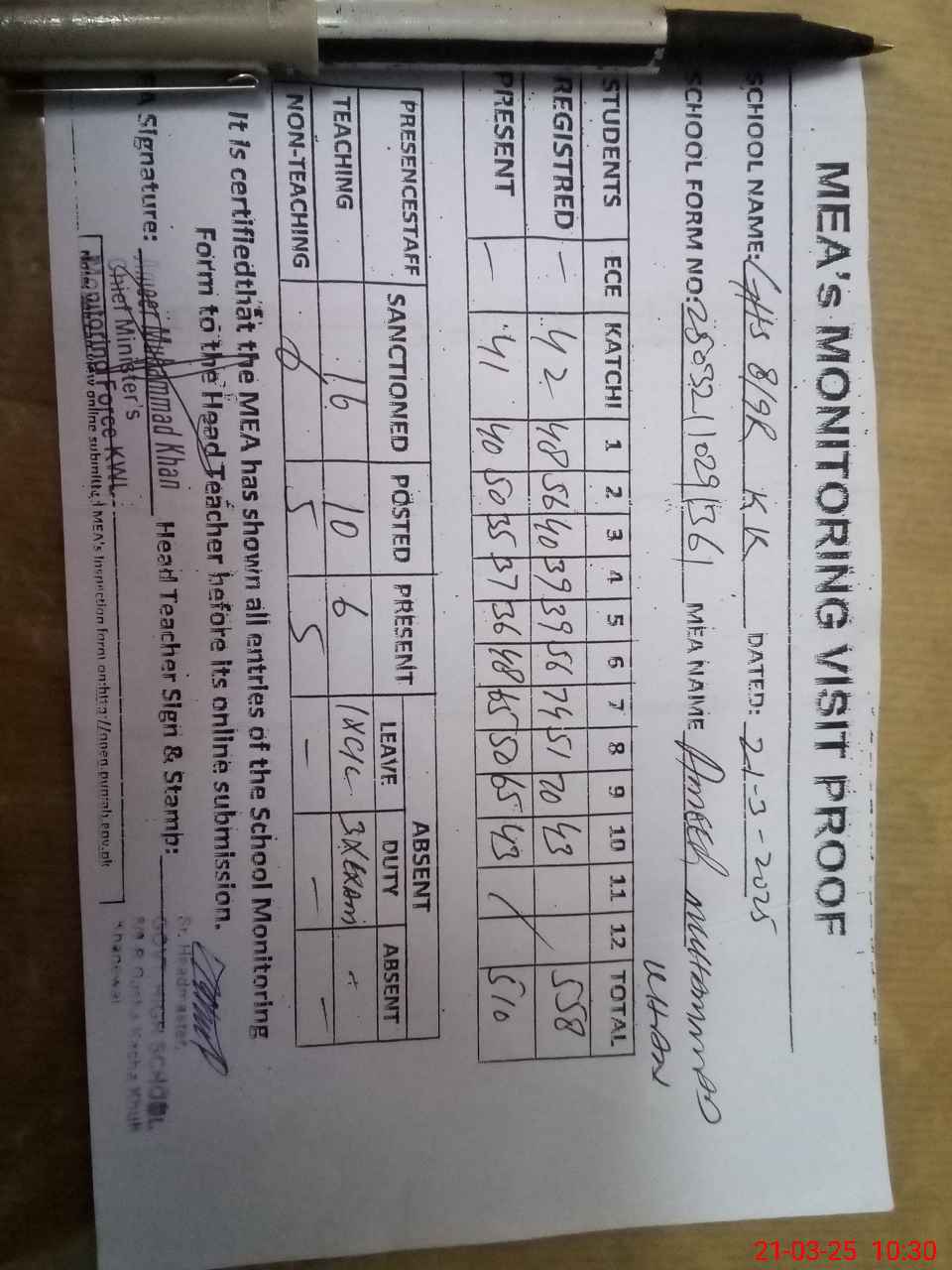 | Attendance Register | Head Teacher | MEA with School | Visit Proof |