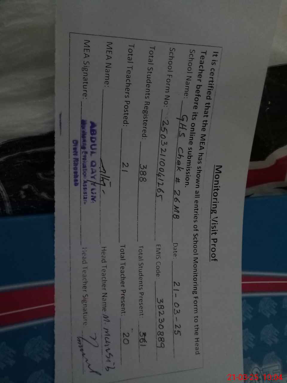 | Attendance Register | Head Teacher | MEA with School | Visit Proof |