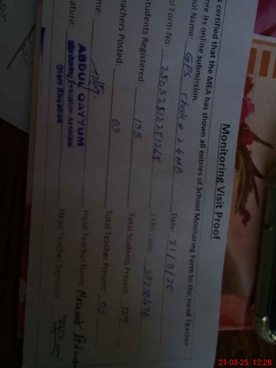 | EMIS Code: 38230476 | Name of School: GPS CHAK NO. 24 MB | |||