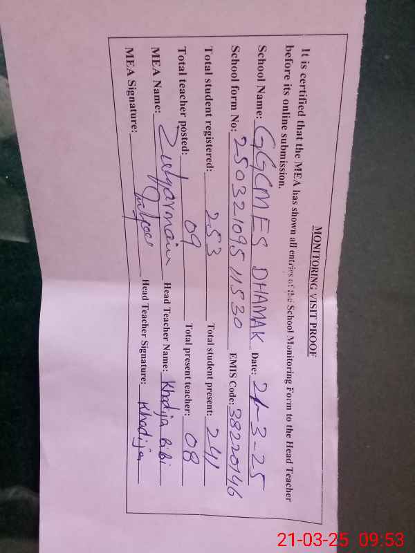 | EMIS Code: 38220146 | Name of School: GGCMHS DHAMAK | |||
