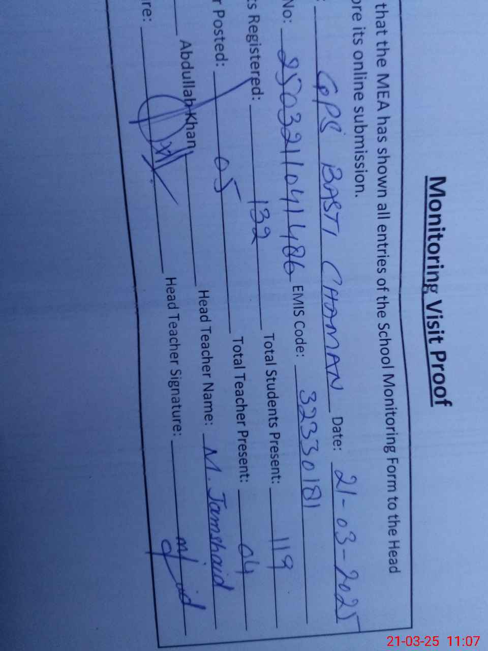| Attendance Register | Head Teacher | MEA with School | Visit Proof |