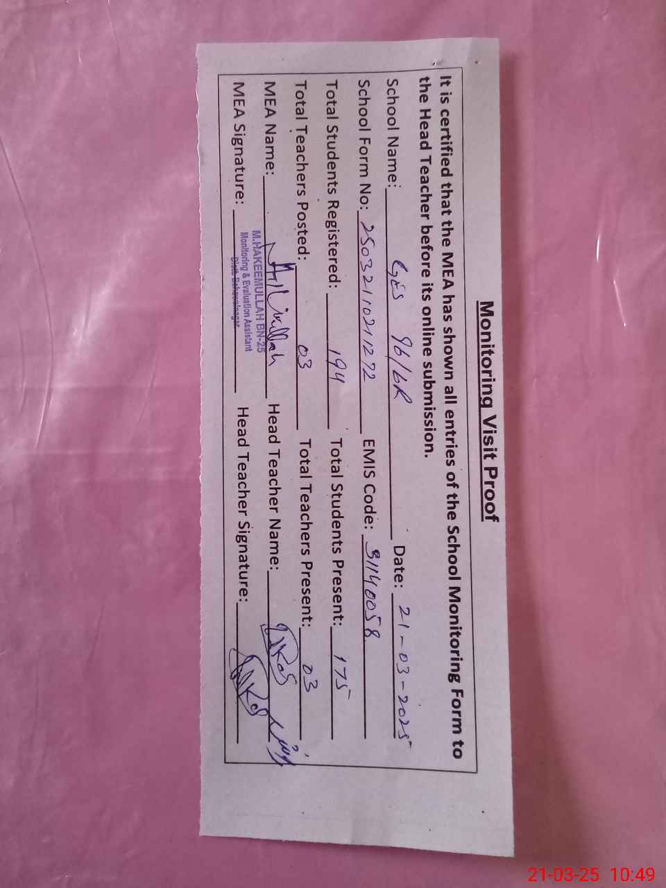 | Certified that this School was Inspected by the Undersigned MEA/DMO Today and the Information Stated Above is as Per Record. | |||||