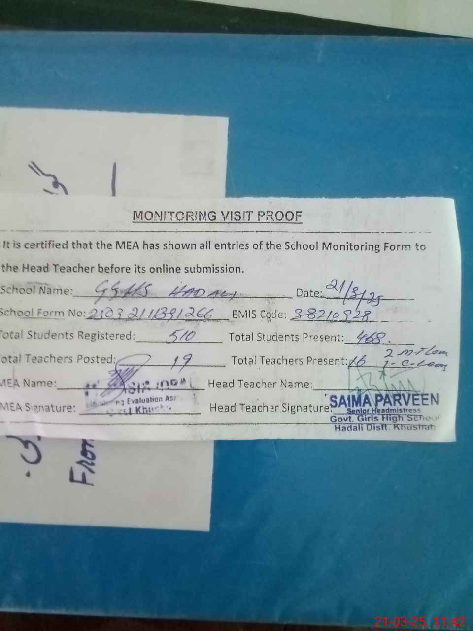 | Attendance Register | Head Teacher | MEA with School | Visit Proof |