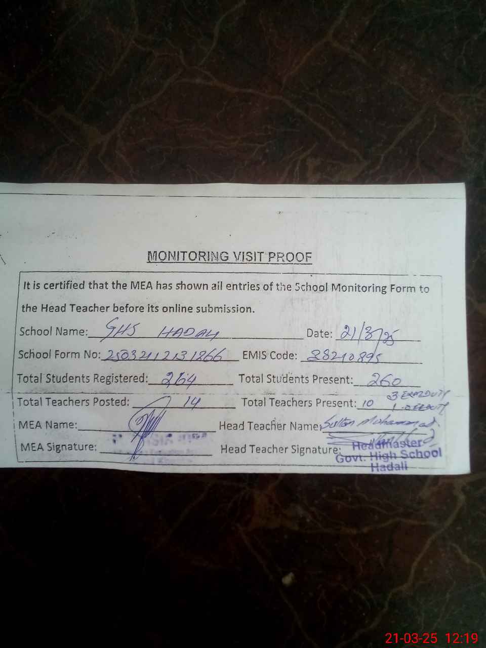 | EMIS Code: 38210895 | Name of School: GHS HADALI | |||