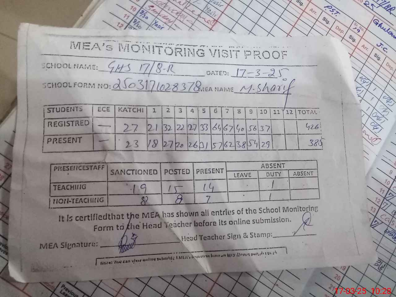 | Attendance Register | Head Teacher | MEA with School | Visit Proof |