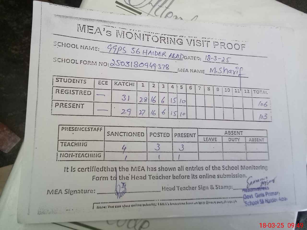 | Attendance Register | Head Teacher | MEA with School | Visit Proof |