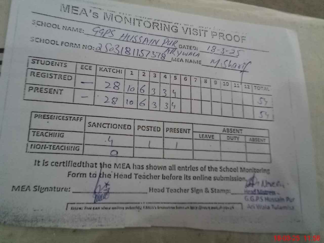 | EMIS Code: 36430385 | Name of School: GGPS HUSSAIN PUR ARI WALA, TULAMBA | |||