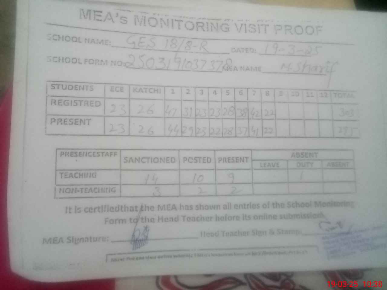| Attendance Register | Head Teacher | MEA with School | Visit Proof |