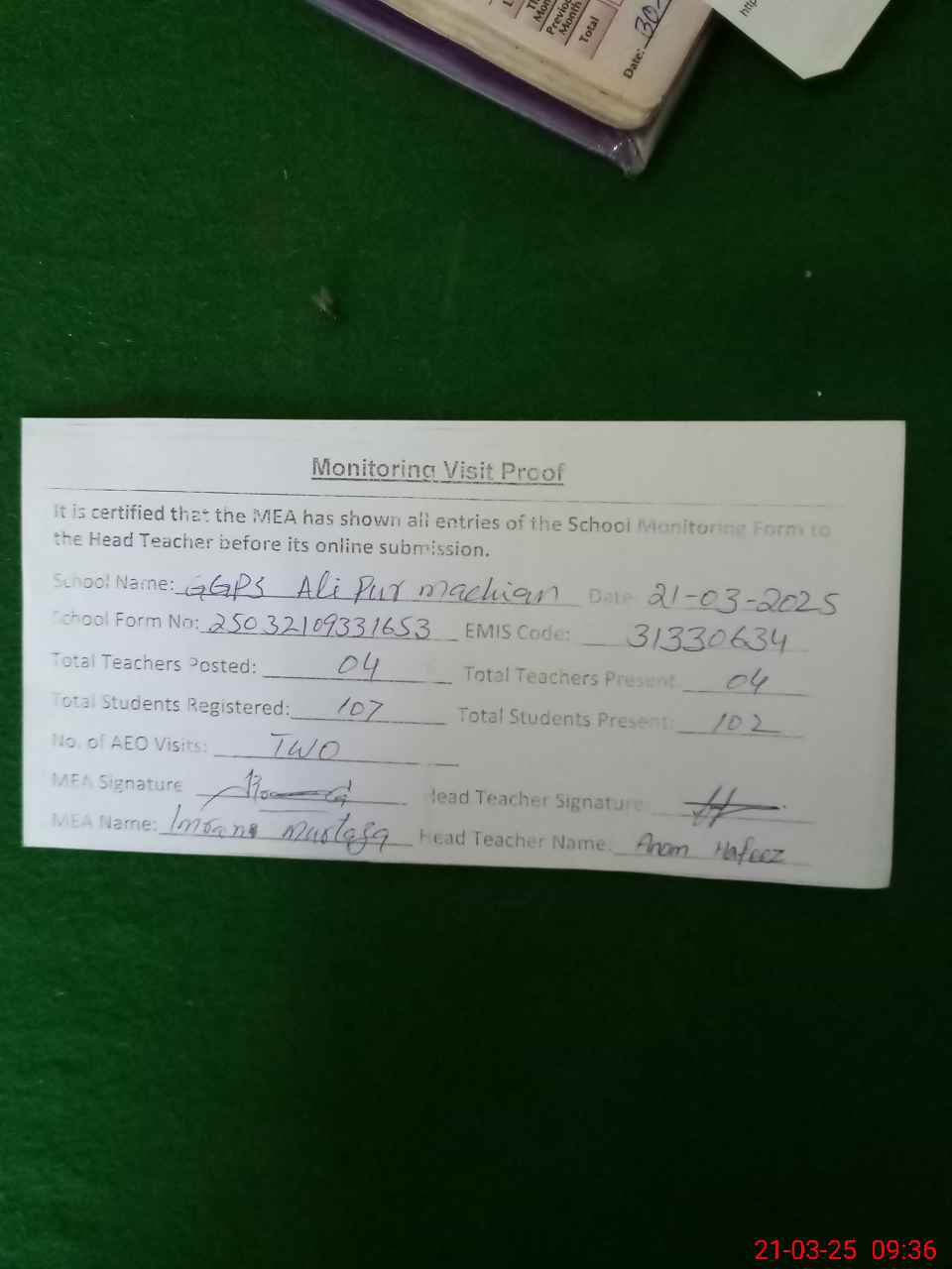 | Attendance Register | Head Teacher | MEA with School | Visit Proof |