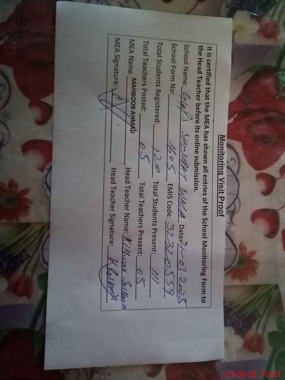 | Attendance Register | Head Teacher | MEA with School | Visit Proof |