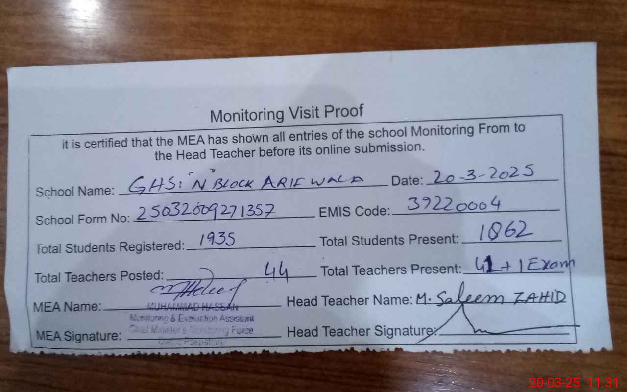 | EMIS Code: 39220004 | Name of School: GHS ARIFWALA N BLOCK | |||