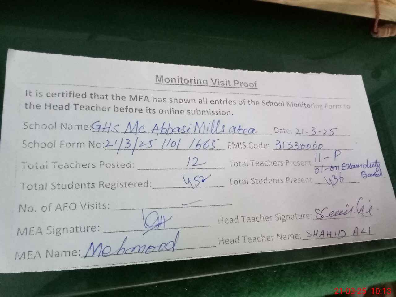 | Monitoring Date: 21-03-2025 | Start Time: 21-03-2025 09:28 AM | End Time: 21-03-2025 10:15 AM | Name of MEA: Ma**** UlHa**** | |