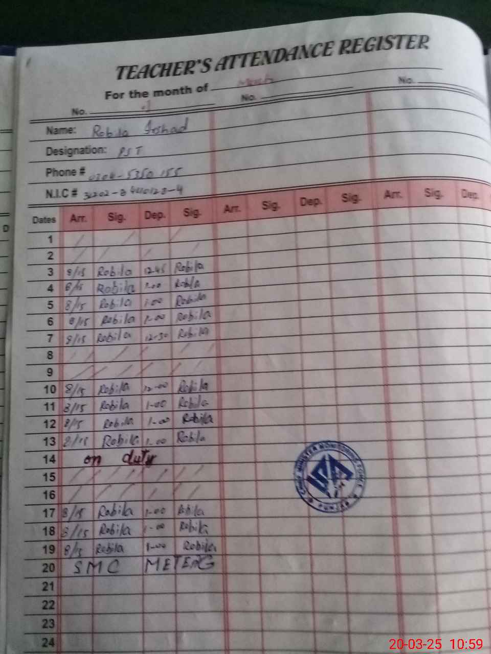 | CNIC | Full Name | Designation | R/C | Absence During Last Calender Month |