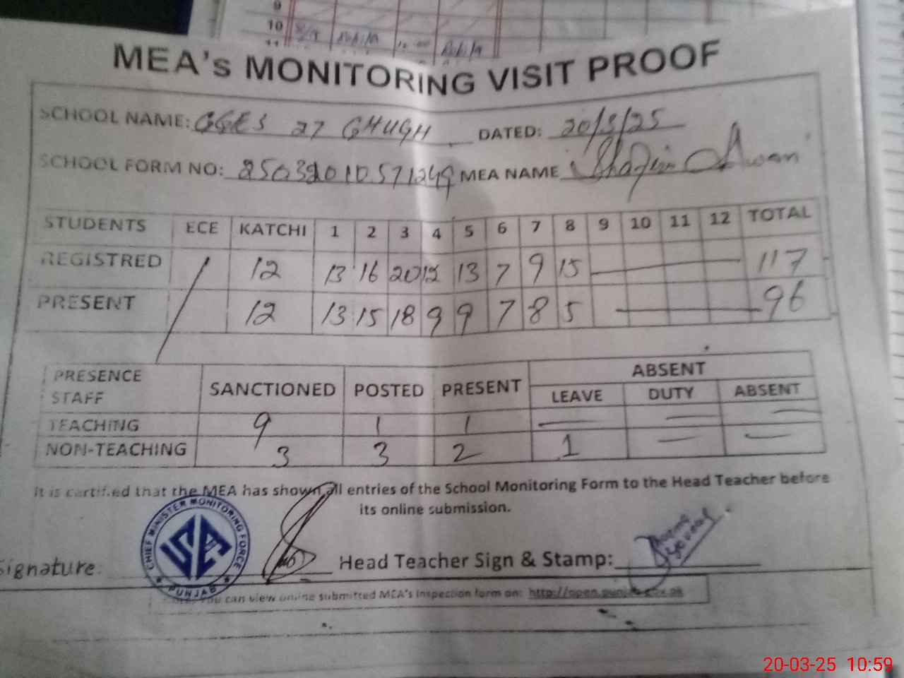 | Attendance Register | Head Teacher | MEA with School | Visit Proof |