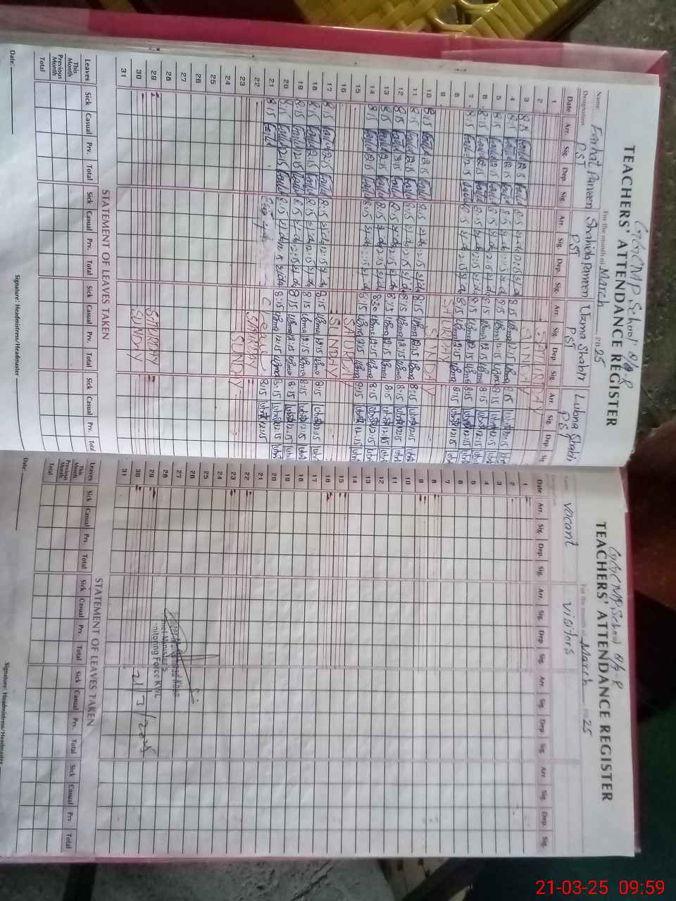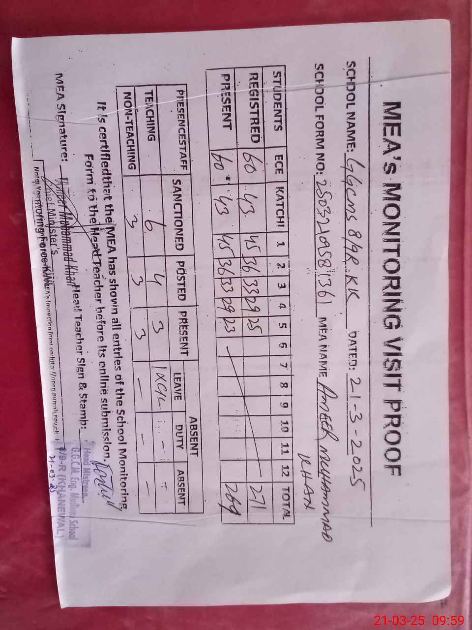 | Attendance Register | Head Teacher | MEA with School | Visit Proof |