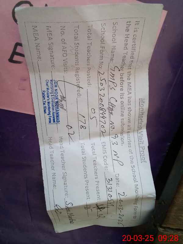 | EMIS Code: 31310549 | Name of School: GMPS CHAK NO. 93/NP (After Noon) | |||