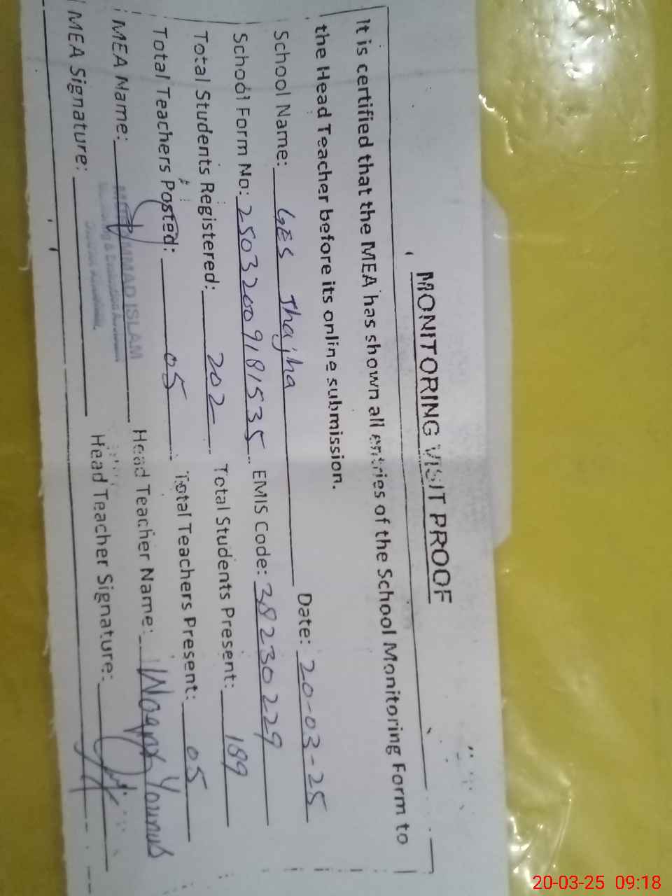 | Attendance Register | Head Teacher | MEA with School | Visit Proof |