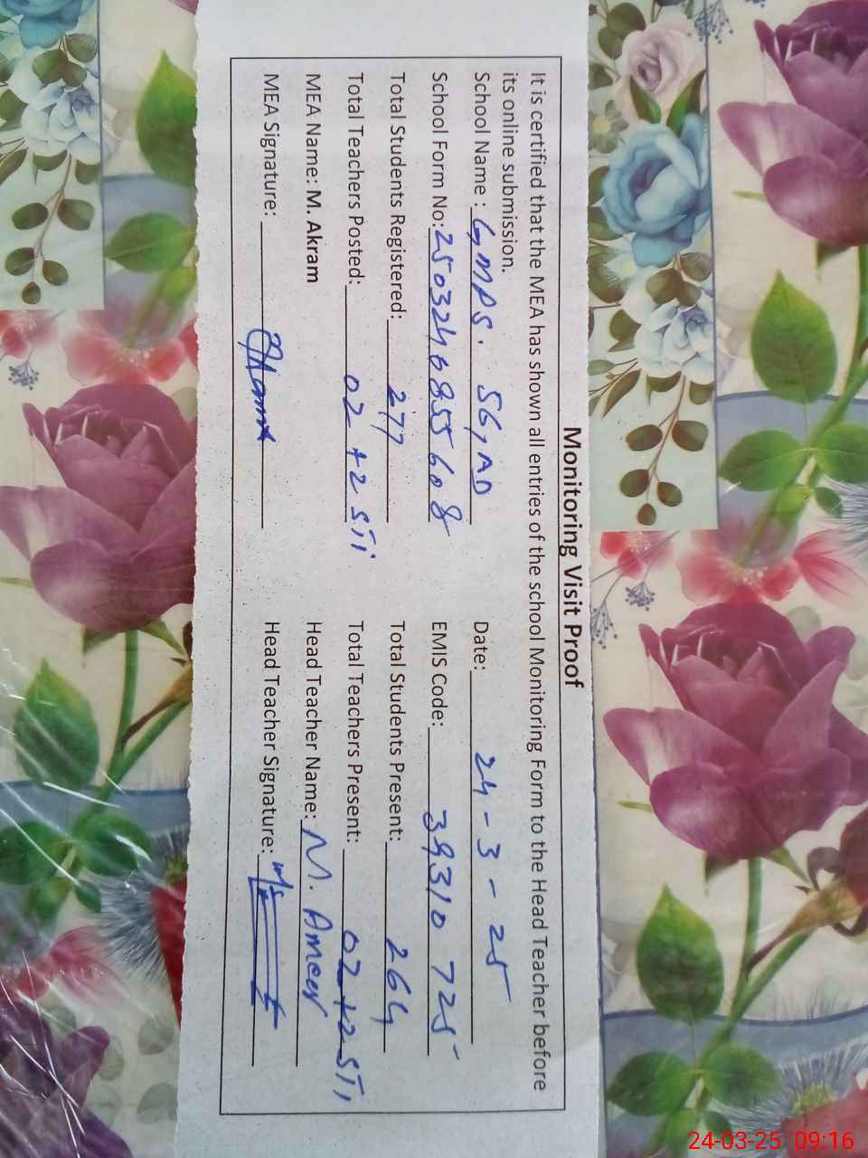| Attendance Register | Head Teacher | MEA with School | Visit Proof |