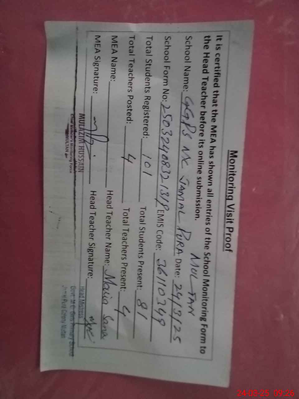 | Attendance Register | Head Teacher | MEA with School | Visit Proof |