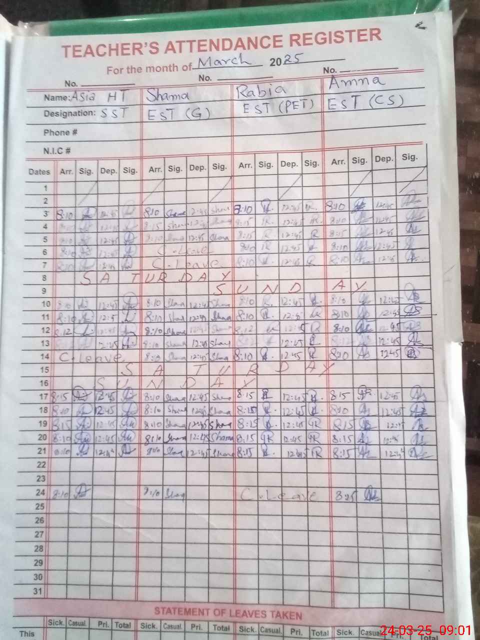 | Leave | Duty | Absent | Maternity | Medical | Ex- Pak |