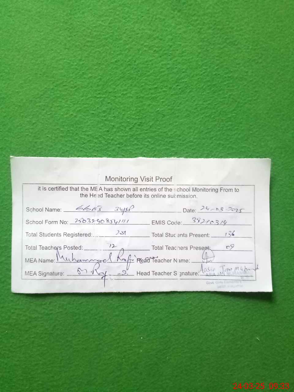 | Attendance Register | Head Teacher | MEA with School | Visit Proof |