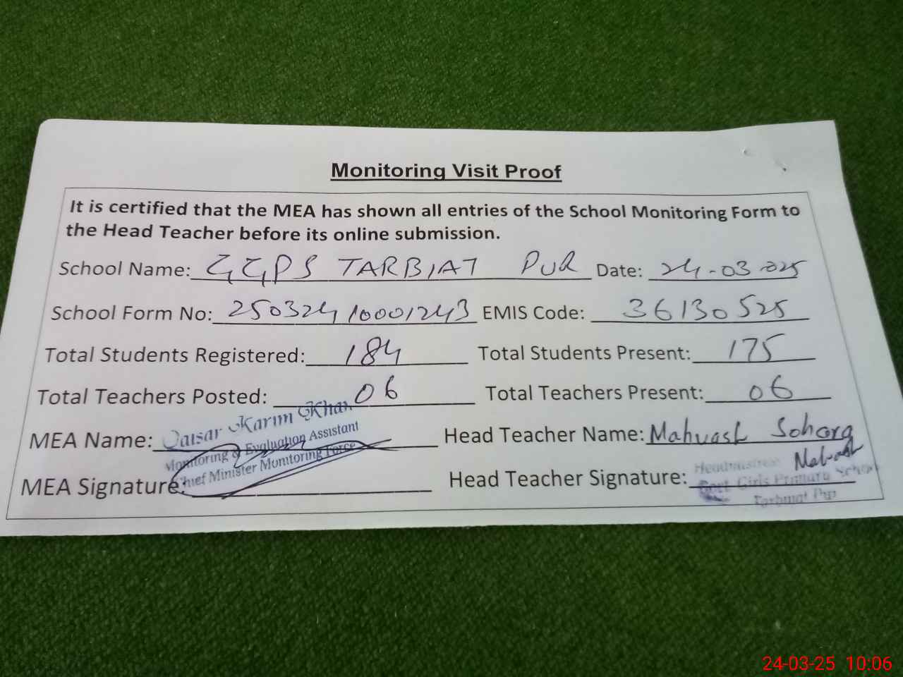 | EMIS Code: 36130525 | Name of School: GGPS TARBIAT PUR | |||