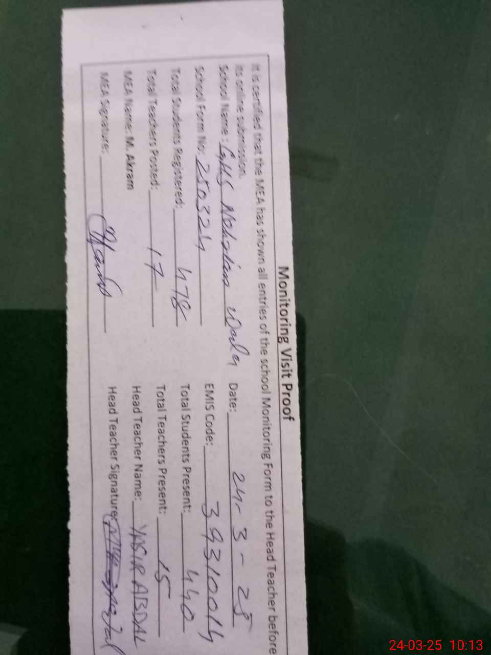 | Attendance Register | Head Teacher | MEA with School | Visit Proof |