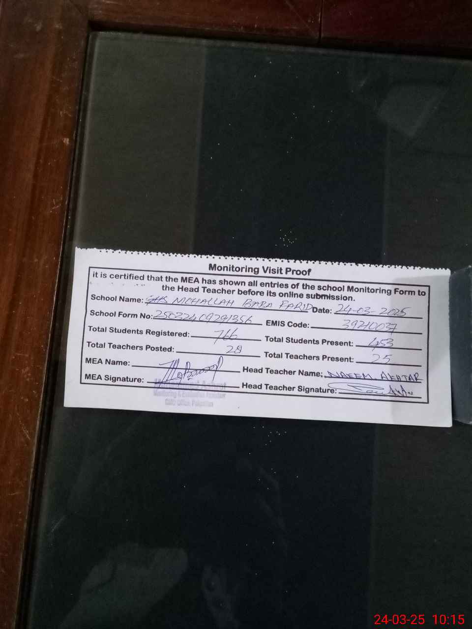 | Certified that this School was Inspected by the Undersigned MEA/DMO Today and the Information Stated Above is as Per Record. | |||||